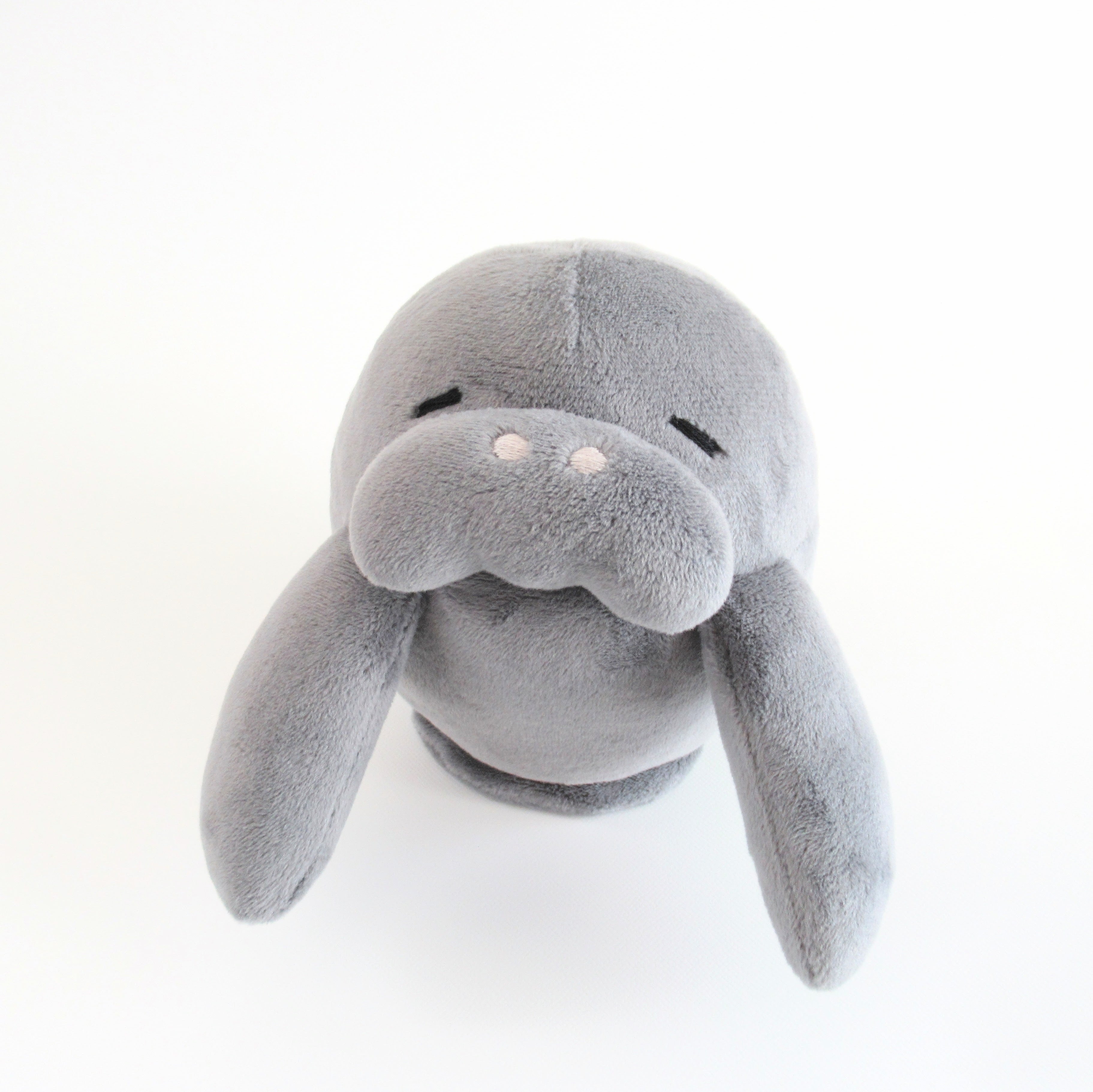 おっとりマナティーさんのまんまるふわふわの、抱っこにちょうどいいサイズのぬいぐるみです。